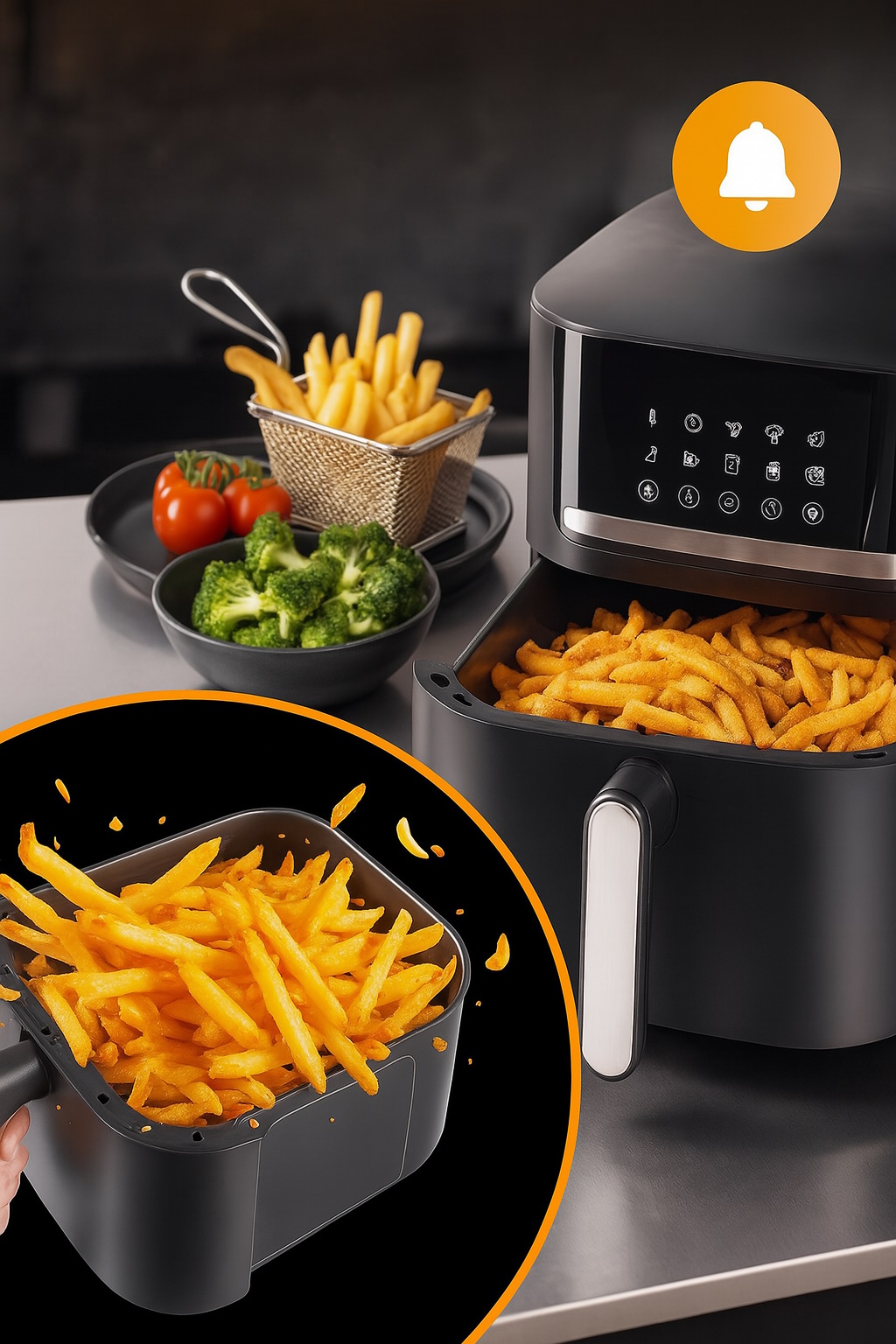 Multifunkčná teplovzdušná fritéza GOURMETmaxx 4v1 (6 l) spája rúru, gril, fritézu a sušičku v jednom. Vďaka výkonu 1600W, cirkulácii vzduchu 360° a teplotnému rozsahu 80–200°C pripravia chrumkavé pokrmy s minimom tuku.