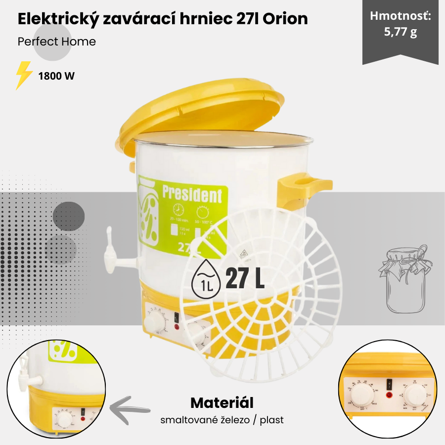 Univerzálny 27-litrový hrniec má smaltovaný, hygienický povrch a skryté výhrevné teleso. class=“ryNqvb“>Je vybavený praktickým plastovým vekom na zatváranie. Možno ho použiť aj na ohrev čaju, vareného vína a iných teplých nápojov.