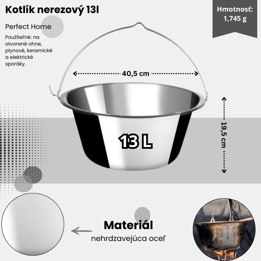 Nerezový kotlík 13L Univerzálne použitie – otvorený oheň, plynový, elektrický aj keramický sporák Kvalitná nerezová oceľ pre dlhú životnosť a jednoduchú údržbu
