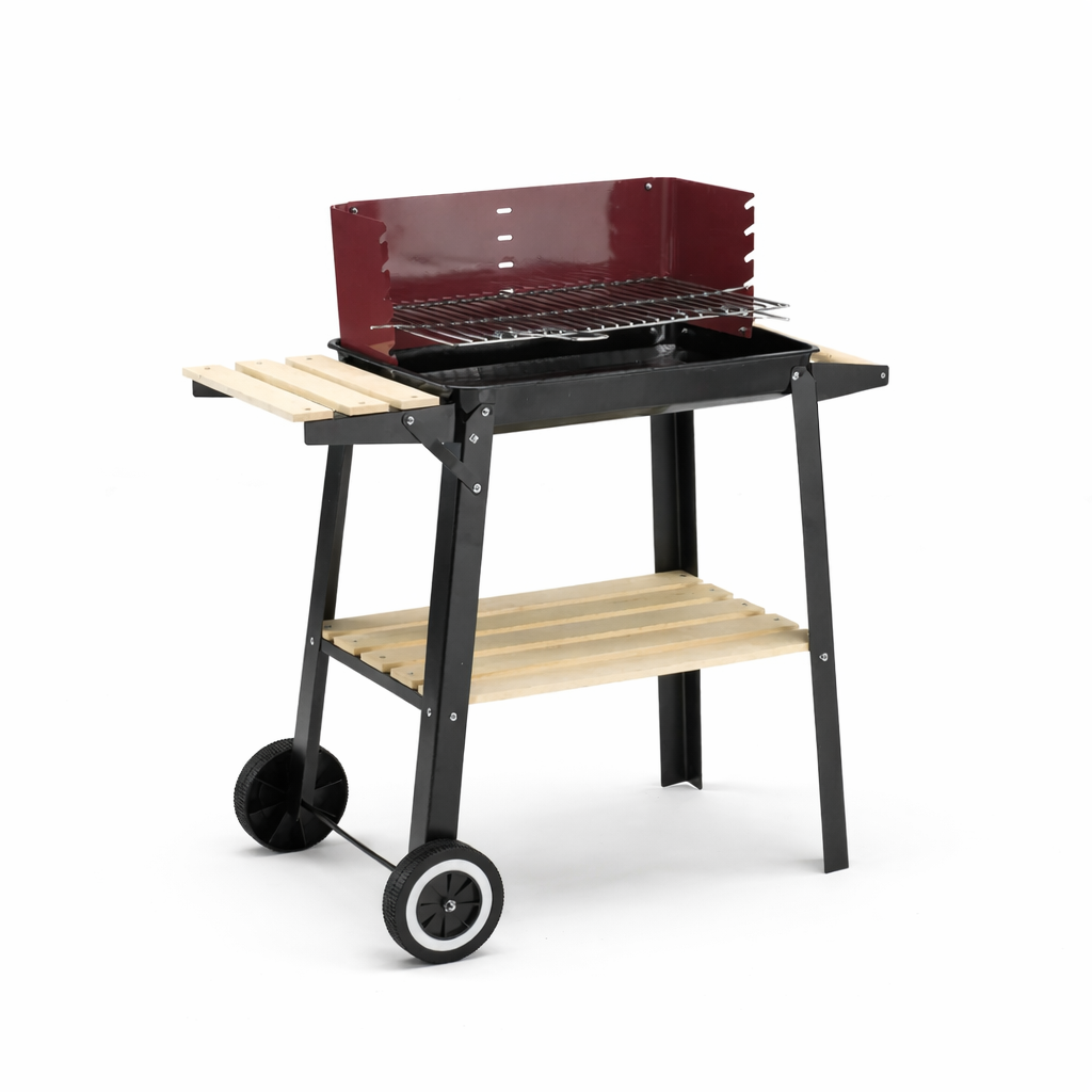 Jednoduchý grilovací vozík na drevené uhlie so smaltovaným ohniskom a dvomi drevenými policami. Vhodný na bežné záhradné grilovanie pre menšie skupiny.