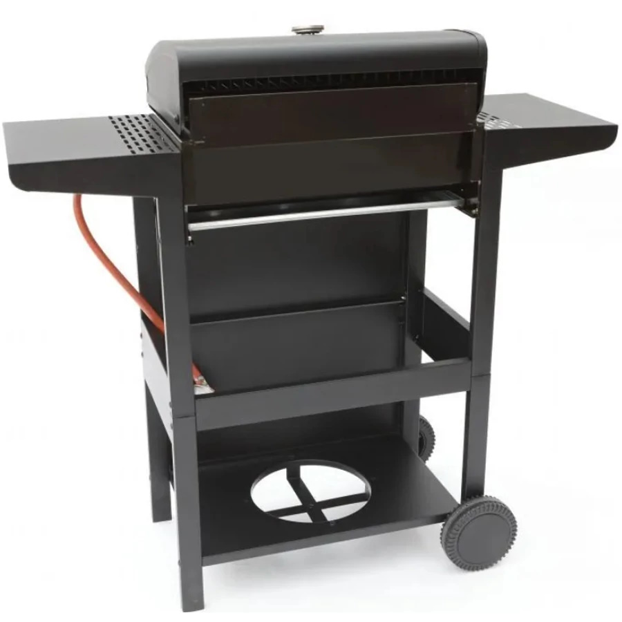 Opis produktu: Gril má 2 horáky a je určený na prípravu jedál približne pre 4–6 osôb. Konštrukcia z ocele a plastu je doplnená dvoma kolieskami pre ľahké presúvanie. Praktický držiak umožňuje uloženie 5kg plynovej fľaše. Súčasťou je miska na zachytávanie tuku a 2 sklápacie bočné stolíky na úsporu miesta pri skladovaní.