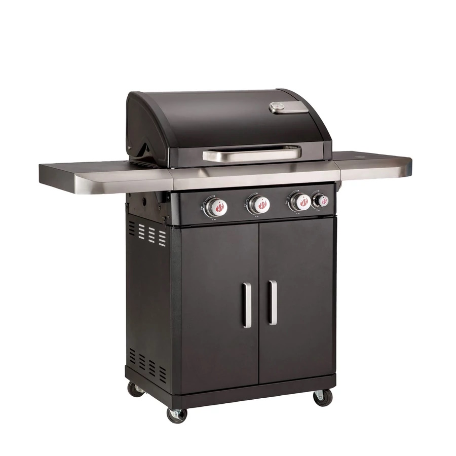 Opis produktu: Gril je vybavený 3 nerezovými horákmi a 1 bočným horákom na prípravu príloh alebo omáčok. Smaltované liatinové rošty zabezpečujú výborné držanie tepla a rovnomerné prepečenie. Dvojstenné veko s teplomerom umožňuje presnú kontrolu teploty počas grilovania. Vďaka systému PTS je rozloženie tepla po celej ploche optimálne. Gril má praktickú skrinku na uskladnenie príslušenstva a kolieska pre jednoduchú manipuláciu.