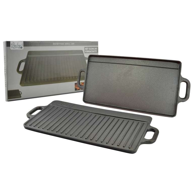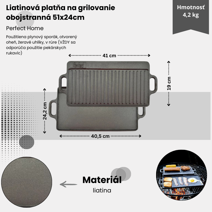 Grilovacia doska je obojstranná, rebrovaná strana je vhodná na grilovanie mäsa, klobás, párkov, rýb atď. hladká strana je vhodná na pečenie zeleniny, príloh a iných pochutín. Okraj panvice zabraňuje odkvapkávaniu tuku, 2 pevné rukoväte: robustné, kvalitné a odolné. Veľmi dobrá akumulácia tepla/rozvod tepelnej energie, vhodné pre plynové grily, plynové varné stoličky, do rúry, tiež do otvoreného ohňa alebo na drevené uhlie či brikety. Liatina je zaistená povrchovou úpravou, rastlinným olejom proti hrdzaveniu, ktorý treba pred prvým použitím odstrániť.