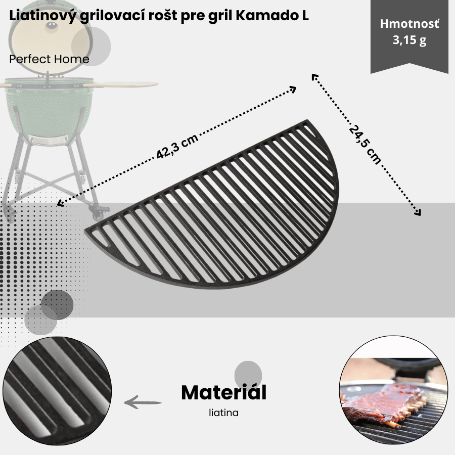 Popis: Tento polmesiacový liatinový grilovací rošt je určený pre grily Kamado veľkosti M. Liatinový materiál poskytuje vynikajúcu tepelnú vodivosť a umožňuje rovnomerné prepečenie potravín. Robustné prevedenie zaisťuje dlhú životnosť a odolnosť voči vysokým teplotám. Polmesiacový tvar umožňuje kombinovať rôzne typy grilovacích plôch – napríklad kameň, nerezový rošt či druhý liatinový segment – pre maximálnu univerzálnosť pri grilovaní.