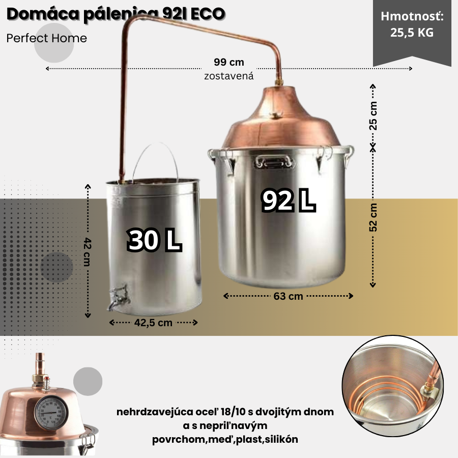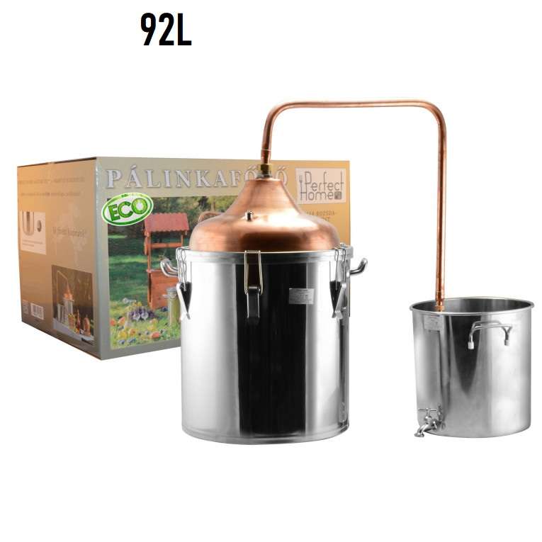 Veľkoobjemová domáca sada 92l z nerezovej ocele a medi so sendvičovým dnom pre rovnomerný ohrev. Vhodná na spracovanie ovocných zmesí, výluhov a tinktúr. Kompatibilný s plynovými, elektrickými aj keramickými varičmi.