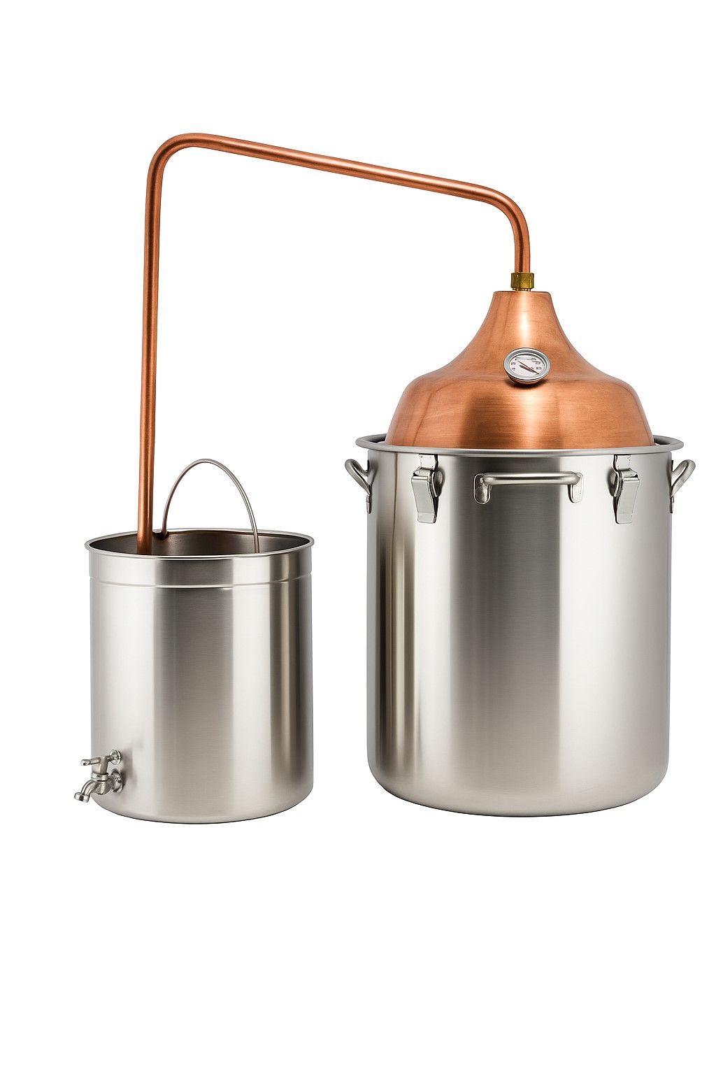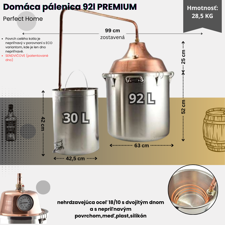 Domáce certifikované zariadenie 92L PREMIUM Perfect Home z nerezovej ocele a medi. Nepriľnavý povrch, sendvičové dno, integrovaný teplomer a tlakový ventil. Vhodné pre plyn, elektrinu, indukciu aj tuhé palivá – ideálne na domáce spracovanie ovocných zmesí a prírodných výluhov.