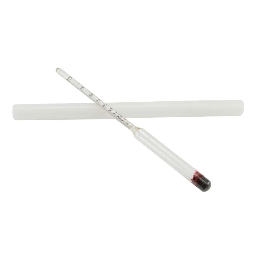 Sklenený merací hustomer s rozsiahlou stupnicou 0–40 jednotiek, vhodný na orientačné meranie hustoty kvapalín. Súčasťou je plastový držiak pre bezpečné uloženie a jednoduchú manipuláciu.
