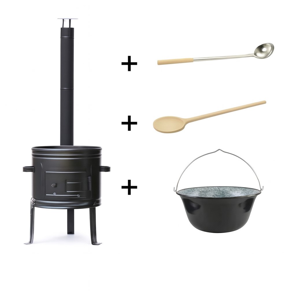 Sezónna akčná zostava 4v1 na guláš Kompletná sada pre milovníkov varenia v prírode. Táto zostava obsahuje všetko potrebné na prípravu chutného guláša, polievok či iných pokrmov nad otvoreným ohňom – kotlinu s komínom, smaltovaný kotlík 8 L, nerezovú naberačku a drevenú varešku. Ideálne pre záhradné oslavy, kempovanie alebo domáce zabíjačky.