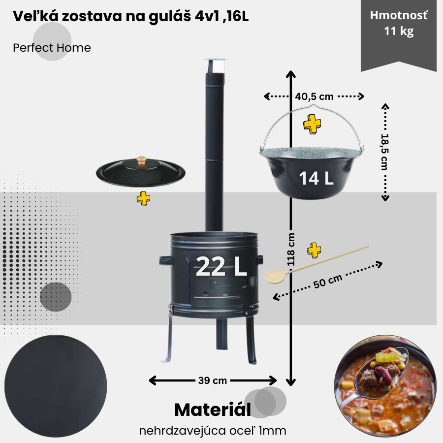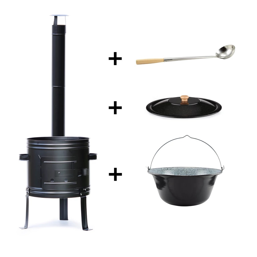 Zostava 4v1 na guláš 14 L Kompletná sada na varenie gulášu, polievok alebo iných pokrmov vonku na záhrade či pri kempovaní. Obsahuje kvalitnú kotlinu s komínom, smaltovaný kotlík 14 L, pokrievku a drevenú varešku. Perfektné riešenie pre všetkých milovníkov varenia v prírode.