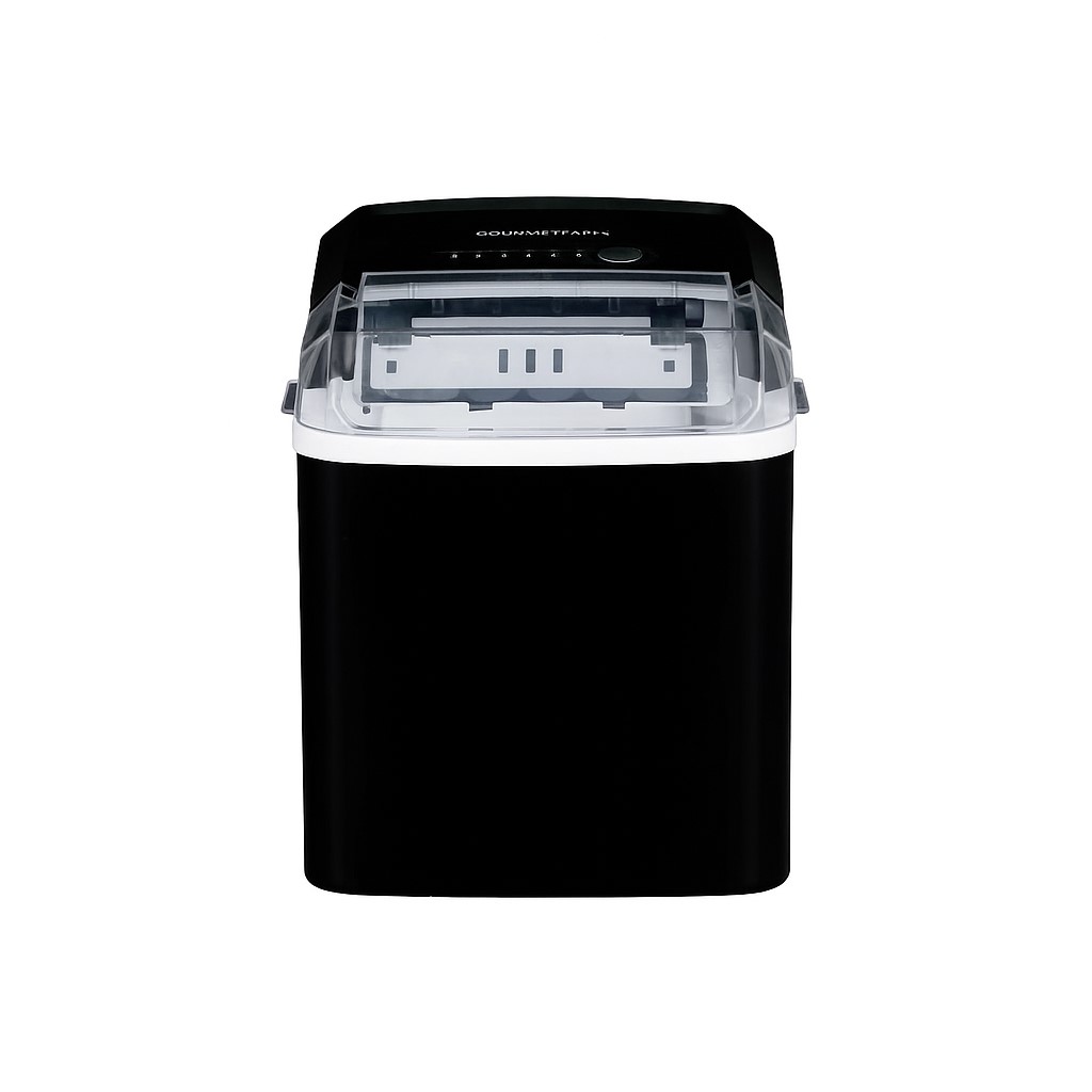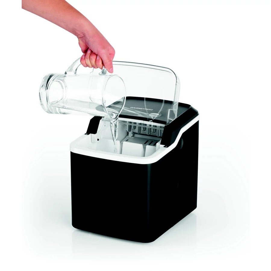 Výrobník ľadu GOURMETmaxx – čierny, kompaktný a výkonný model s kapacitou 1,3 l. Vyrobí 9 kociek ľadu za 8 minút, bez nutnosti pripojenia k vodovodu. Dve veľkosti kociek, tichý chod, ľahké čistenie.