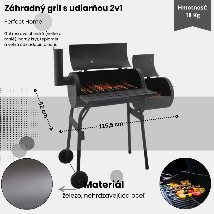 Náš produkt je perfektnou kombináciou drevených uhlových grilov a smokerov. Vo valcovom telese môžeme pripraviť rôzne druhy mäsa, syry, zeleninu a ryby, ale môžeme ich aj údiť, ak naozaj chceme špeciálne príchute.